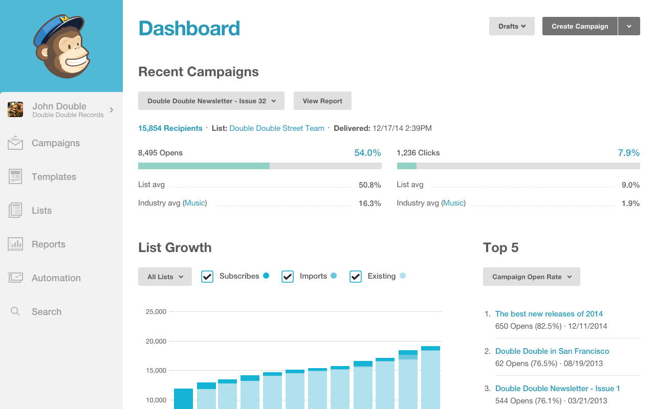 MailChimp的用户对它针对小型企业的强大功能和简单易用赞不绝口。比如,它的拖放电子邮件生成器可以很容易地格式化漂亮的电子邮件,它庞大的集成列表可以很容易地与外部CRM等数据同步。