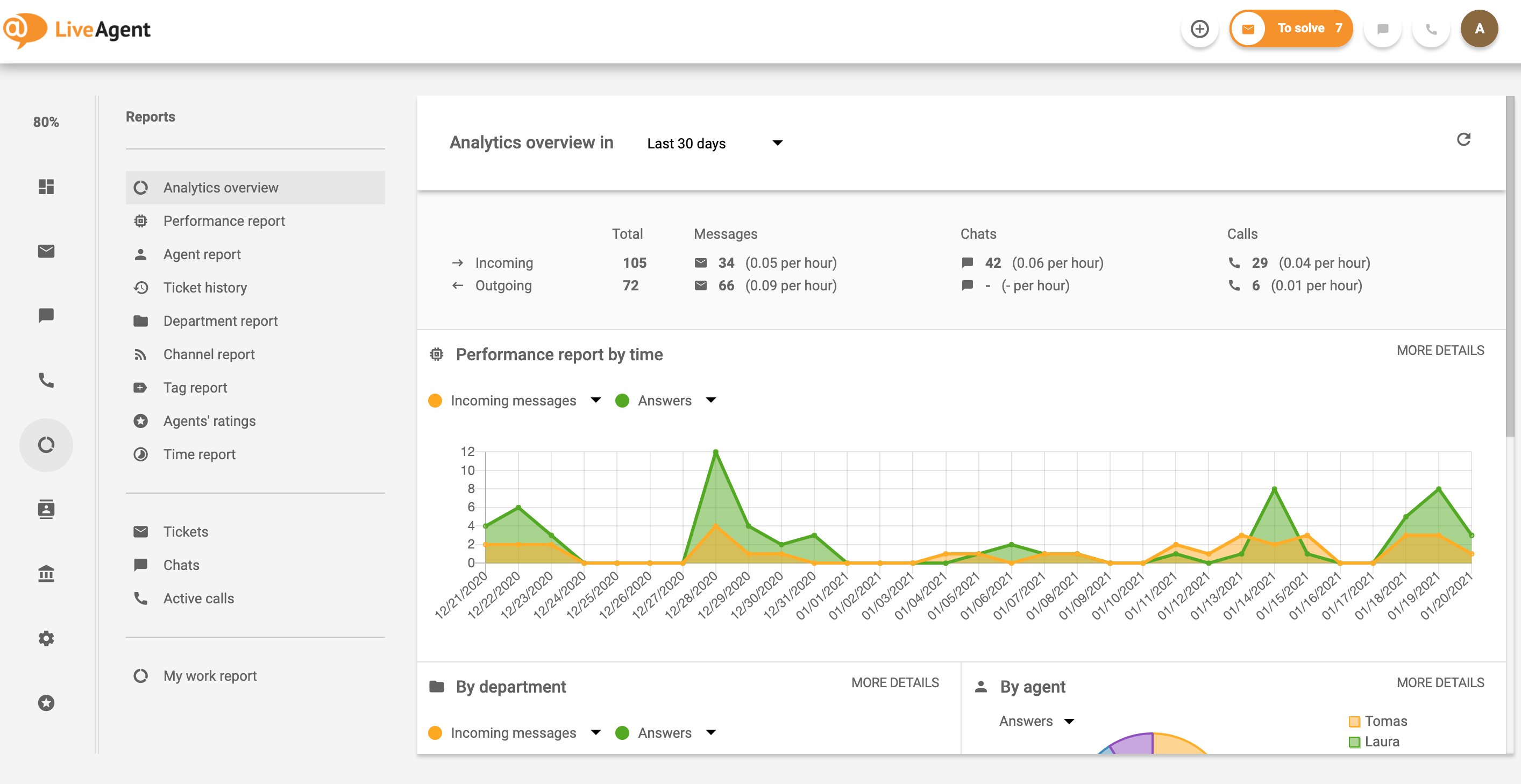 实时分析提供了关于响应时间的详细报告,突出了潜在改进的领域,并确保了对服务级别协议 (SLA) 的遵守。通过优化响应率,组织可以加强[客户服务](/customer-service-software/ ‘发现 10 个由专家排名的最好客户服务软件。比较 LiveAgent、Zendesk 和 Freshdesk 等顶级工具以增强支持!")并改进满意度,最终促进忠诚度和保留。