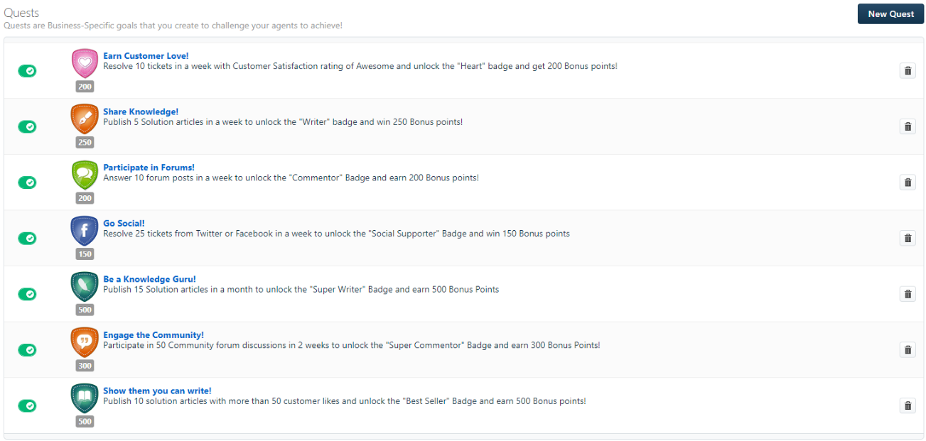 Freshdesk的游戏化是一个将游戏元素添加到客户支持流程中的功能。它使用积分、徽章和奖杯来激励代理更好表现并提高客户满意度。通过Freshdesk的游戏化,客户服务可以成为一项有趣和引人入胜的活动,以提高客服的士气和生产力,同时改善客户体验。