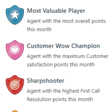 根据我在Freshdesk游戏化功能的经验,我发现根据他们的绩效指标,有四个不同的奖杯授予代理商。第一个是最有价值选手奖杯,授予当月综合积分最高的代理.第二个奖杯是客户“Wow”冠军奖,授予当月客户满意度积分最高的代理商。第三个奖杯叫神枪手,授予当月首次呼叫解决积分最高的代理人,表示他们能够仅通过一次互动解决工单问题。第四个奖杯,极速赛车手,授予最快速解决问题的代理商,以表彰他们在一个小时内解决工单的能力。这个系统的好处在于排行榜在每个月的第一天重置,从而给每个人一个新的开始。作为代理,您可以直接从仪表板查看当前领先排行榜的客服姓名。