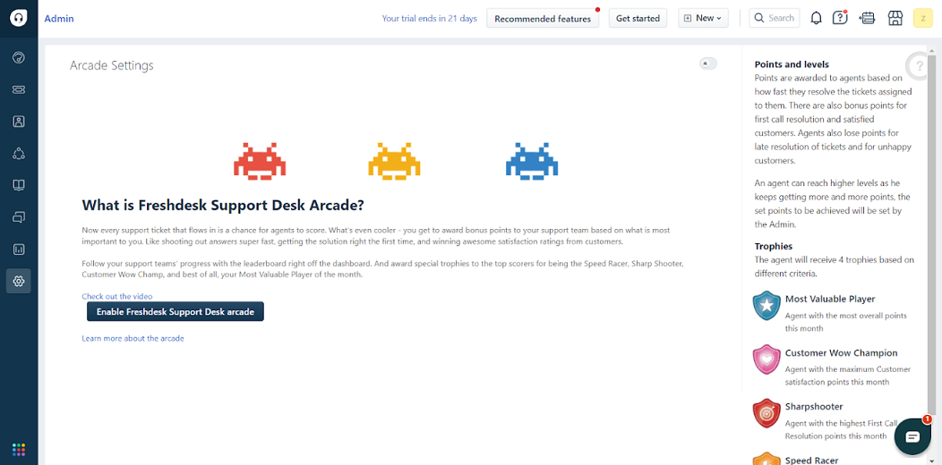一旦完成此操作,下一步是在设置中启用Freshdesk Support Desk Arcade,真正的乐趣即将开始。