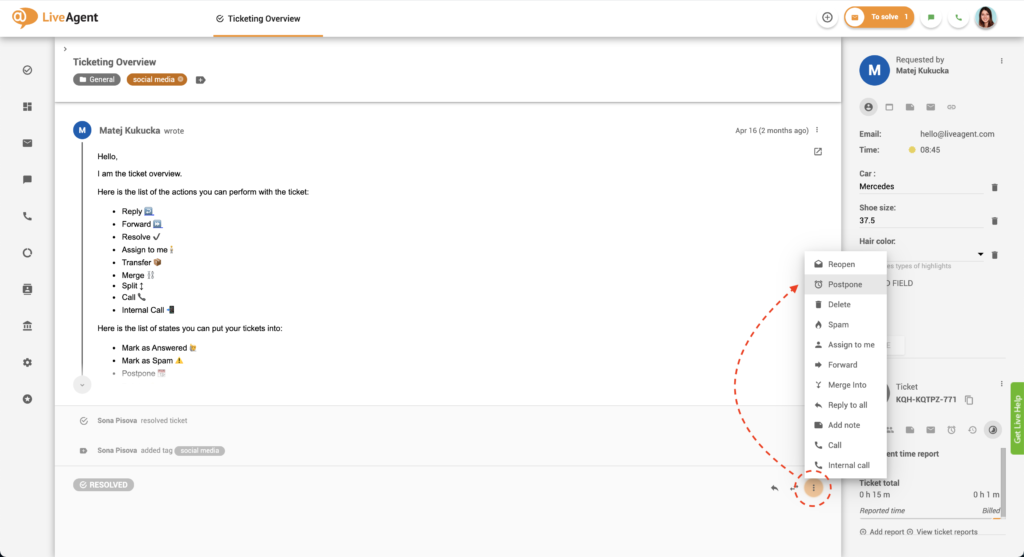 帮助台联系人会存储客户的基本信息,包括他们的名字、电子邮件、电话号码和其他的个人信息。此外,像LiveAgent这样的帮助台软件使您能够创建自定义联系人字段来存储关于您的联系人的独特信息,比如他们的鞋码或汽车型号。