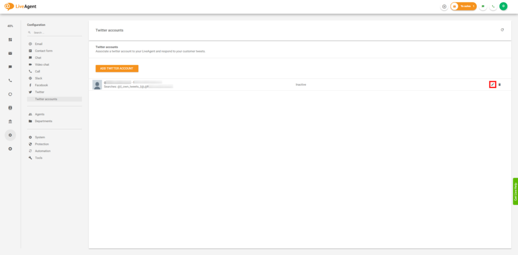 - 一旦您的LiveAgent账户与Twitter连接,点击编辑激活账户。