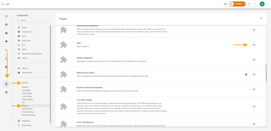 9. 找到Viber并按下按钮启用插件(需要它变成绿色)