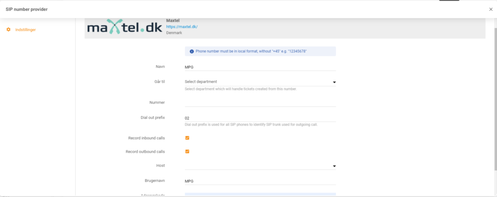 Maxtel.dk已经是LiveAgent的一部分。只需登录并导航至配置 > 呼叫 > 号码> Maxtel.dk。添加VoIP号码就可以使用了。