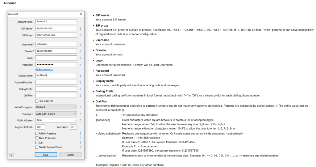 - 安装MicroSIP后,打开它并导航到上面的向下箭头形状的按钮。点击它并选择添加账户。使用上一步的信息填写字段并创建新的MicroSIP账户。集成已经完成,但是在开始使用MicroSIP呼叫之前,还剩下最后一个步骤。